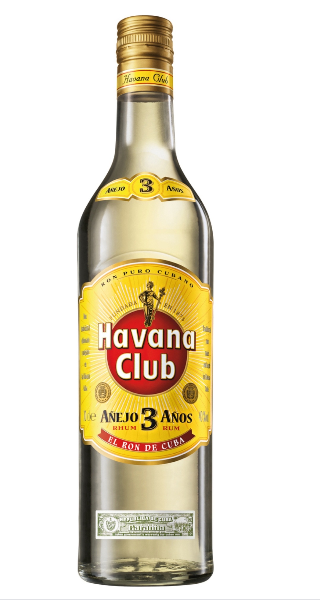 Havana Club 3 Años is a highly regarded light Cuban rum, aged for a minimum of three years in white oak barrels before being charcoal-filtered to achieve its pale, straw-colored appearance. It is widely considered the industry standard for authentic Cuban cocktails.